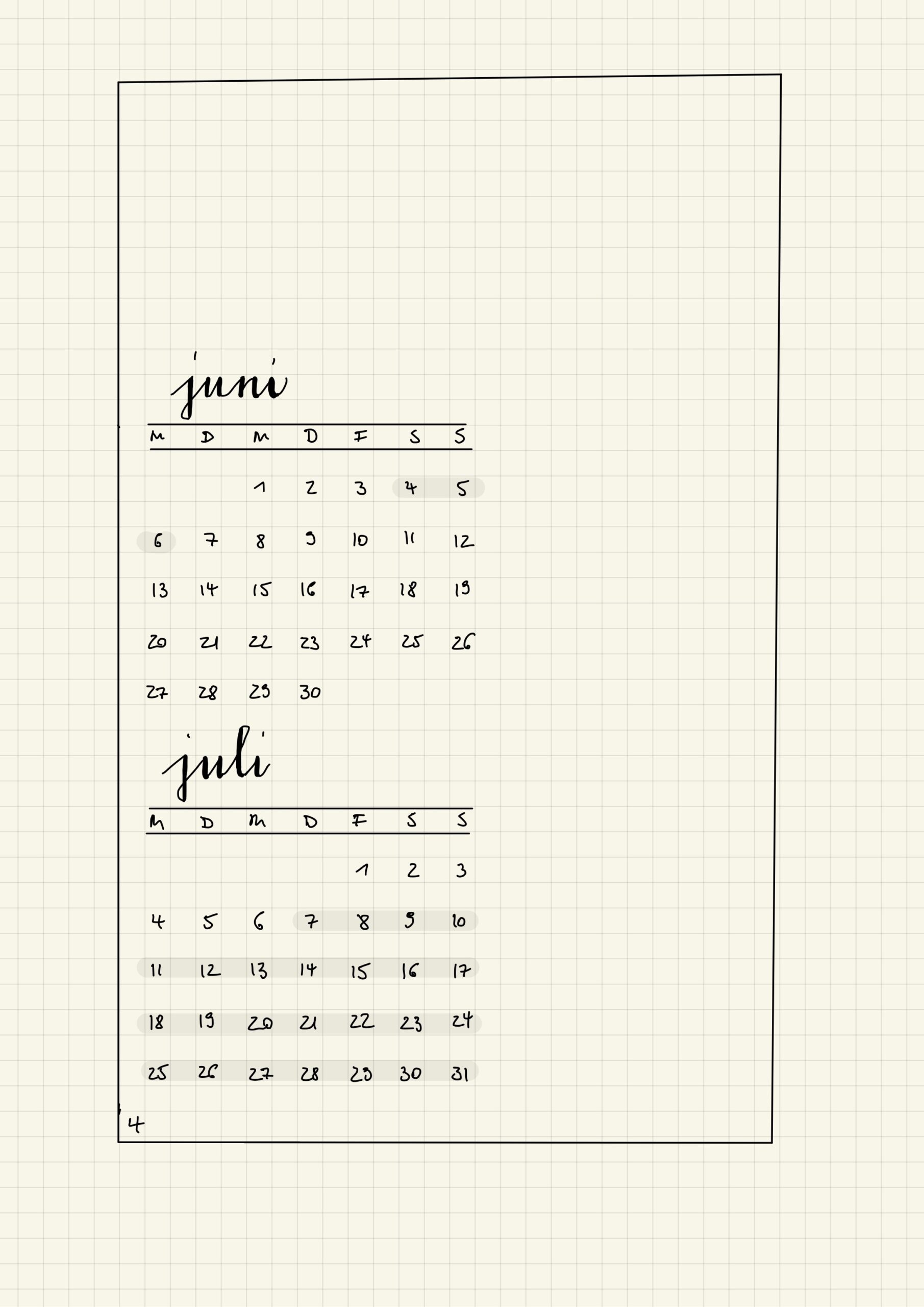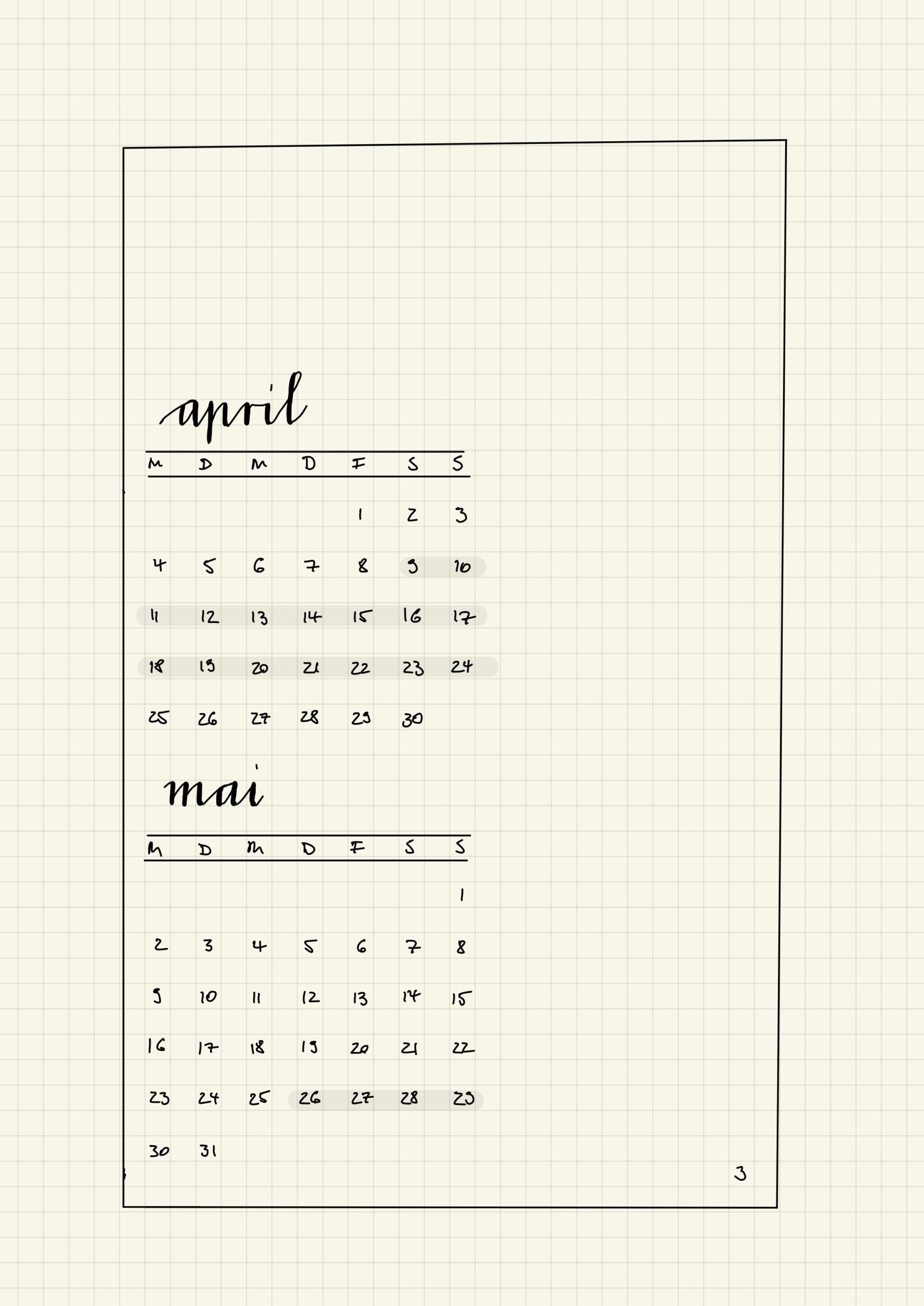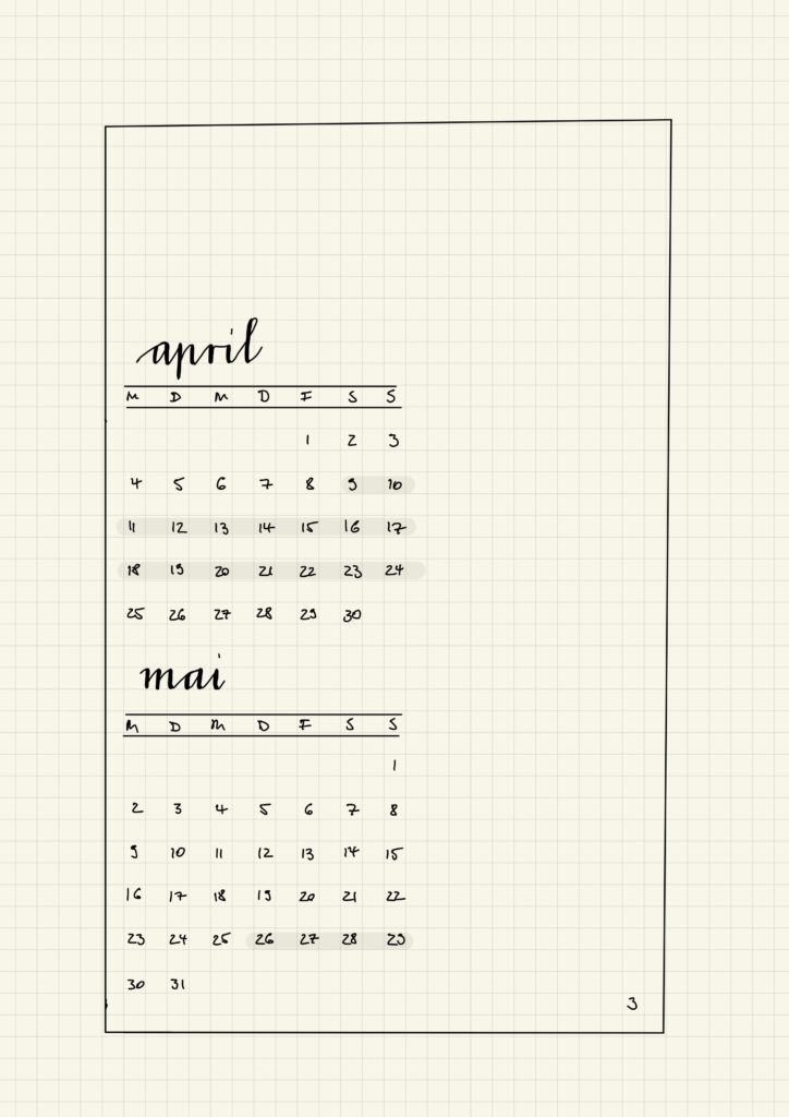 Als nächstes haben wir Ferien und freie Tage (Himmelfahrt, Pfingsten) ins Future Log eingetragen. Nehmt dafür eine unauffällige Farbe, die ihr nicht für andere Zwecke verwenden wollt! Ich liebe mein blasses Grau. Hier auf den Bildern seht ihr dann schon einen ersten Termin, den wir eingetragen haben. Dann war die GZ zu Ende.