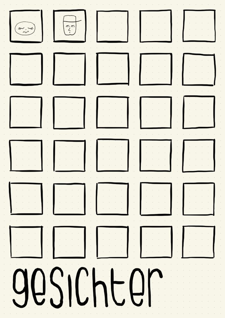 - Schnapp dir eine neue Seite in deinem Bullet Journal, zeichne dir mit einem schwarzen Stift einfach freihand, aber gleich groß viele Quadrate drauf und fülle sie nach und nach mit Gesichtern, wann immer du dazu Lust hast. So in etwa:
