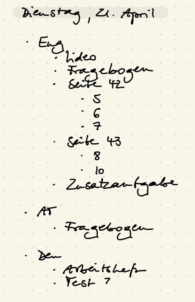 Und so geht es weiter. Das war alles. Im Laufe der Woche, wenn Zeit dafür ist, am besten aber wenigstens am Freitag solltest du kontrollieren, ob du alles erledigt hast, was du schaffen wolltest. Wenn du eine Pflichtaufgabe nicht geschafft hast, schreib doch der entsprechenden Lehrerin kurz.
