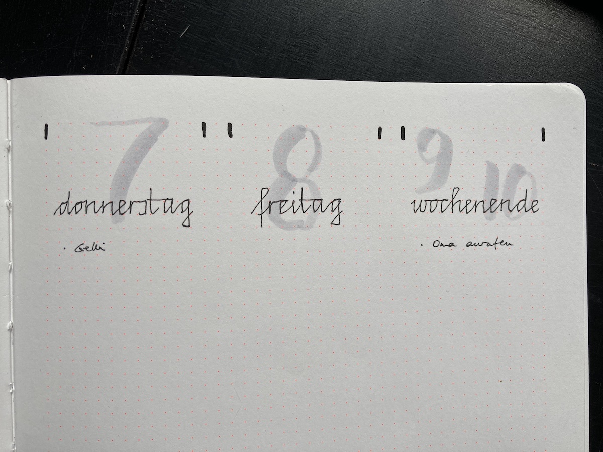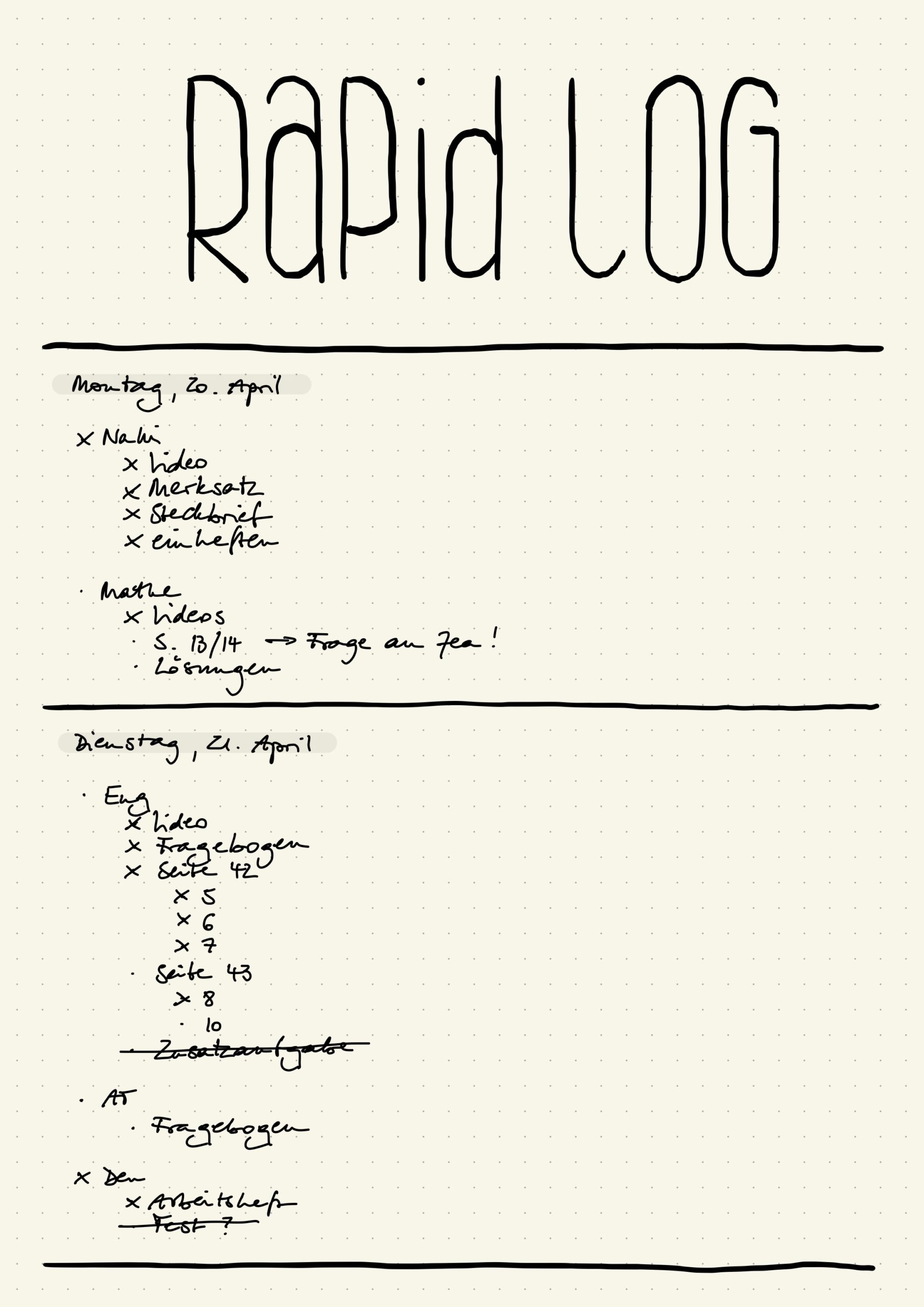 Denkt beim Rapid Log daran: NIEMALS für ganze Woche vorbereiten, sondern immer nur Tag für Tag schreiben. Abends oder am nächsten Morgen kommt der Strich drunter und der neue Tag beginnt.