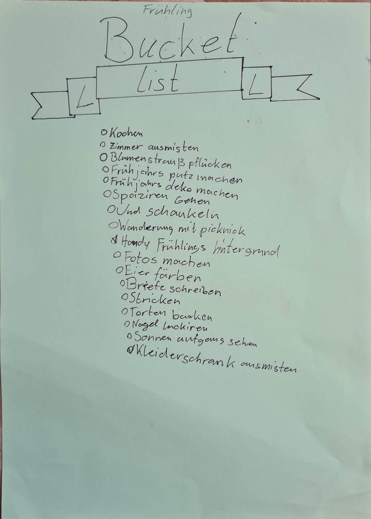 Jetzt schon alles aufzuschreiben, was ihr im Rest eures Lebens noch tun wollt, finde ich persönlich nicht so passend. Wer weiß schon, was die Zukunft bringt? Aber kurz zu überlegen, worauf ich in diesem Frühjahr Lust habe, was ich gern machen, wozu ich mich unbedingt oder endlich mal aufraffen will – das finde ich schon naheliegender (im wahrsten Sinne des Wortes).