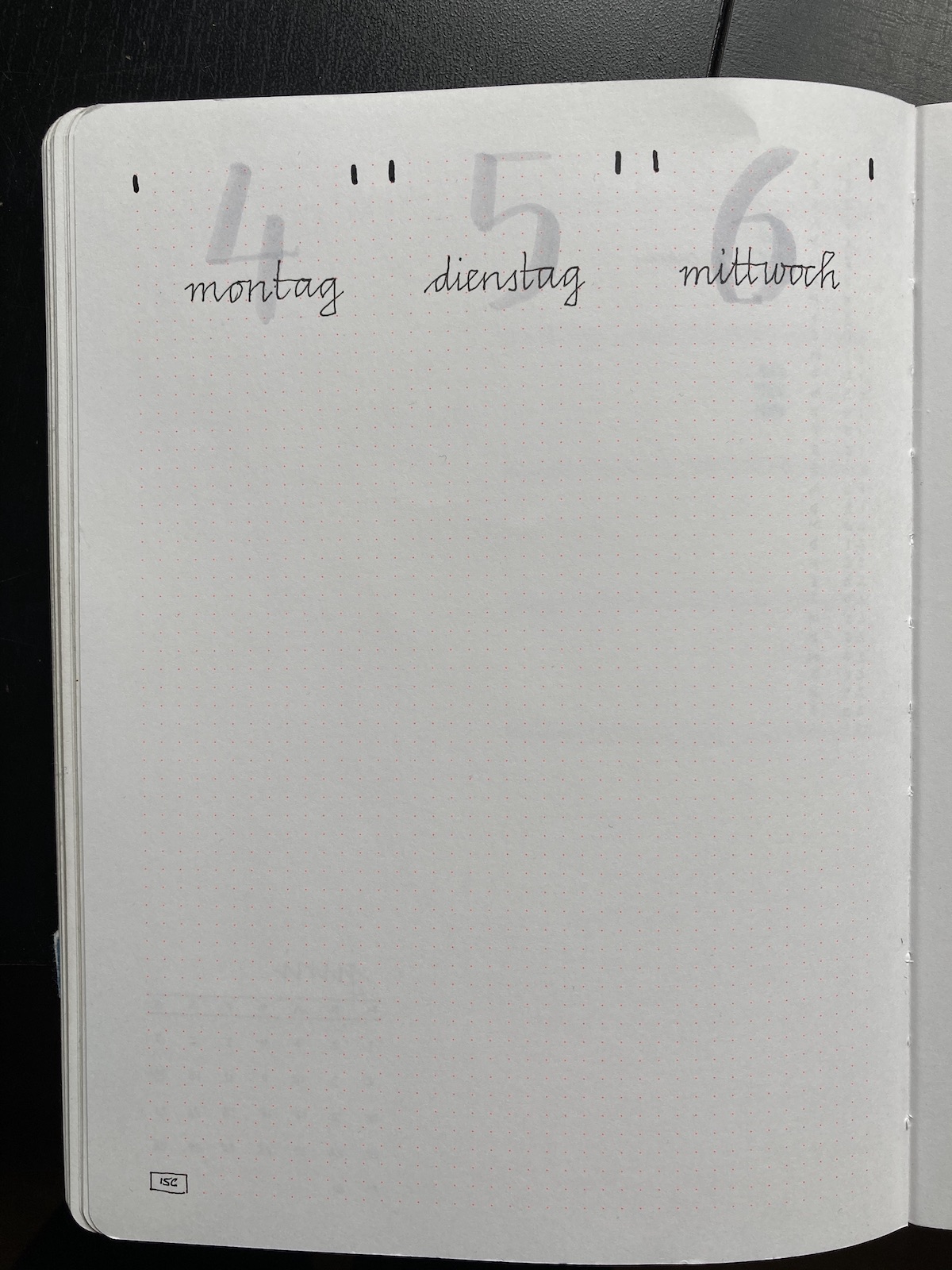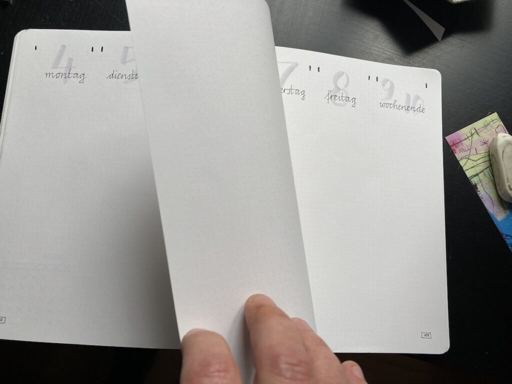 Wir haben jetzt also gar nichts mit krassen Farben und Tabellen und Aufteilungen und so gemacht, sondern das BuJo einfach so genutzt, wie es ursprünglich mal gedacht war. Ich mag solche einfarbigen Seiten ja durchaus, wie ihr sicher wisst. Und daneben hätte ich immer noch jede Menge Platz, um mir Notizen zu machen oder etwas hinzuzufügen: