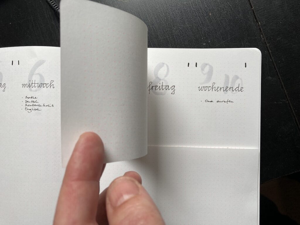 Jetzt schneidet ihr das bisher unbenutzte Blatt, das zwischen Mittwoch und Donnerstag liegt, bis zur Mitte eures Heftes/Buches ein. So in etwa: