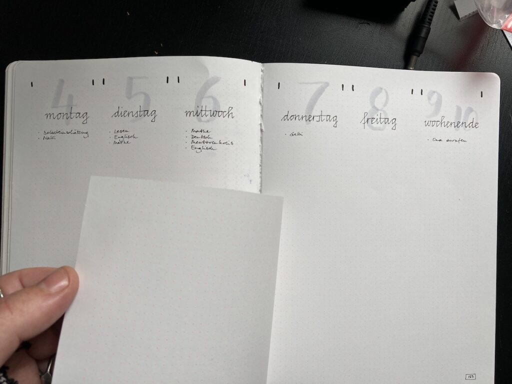 Und jetzt ACHTUNG! Vor der zweiten Hälfte der Woche lasst ihr ein Blatt frei: