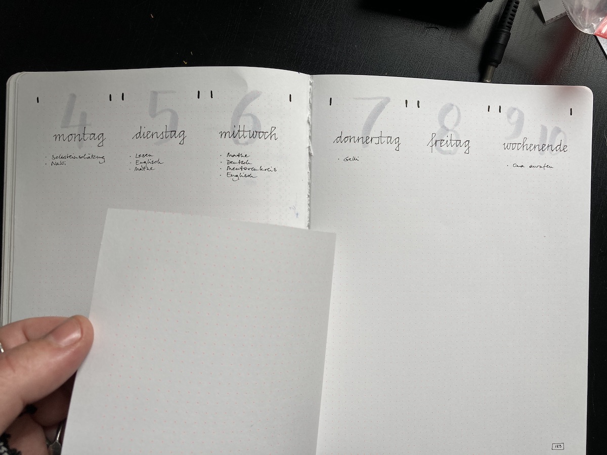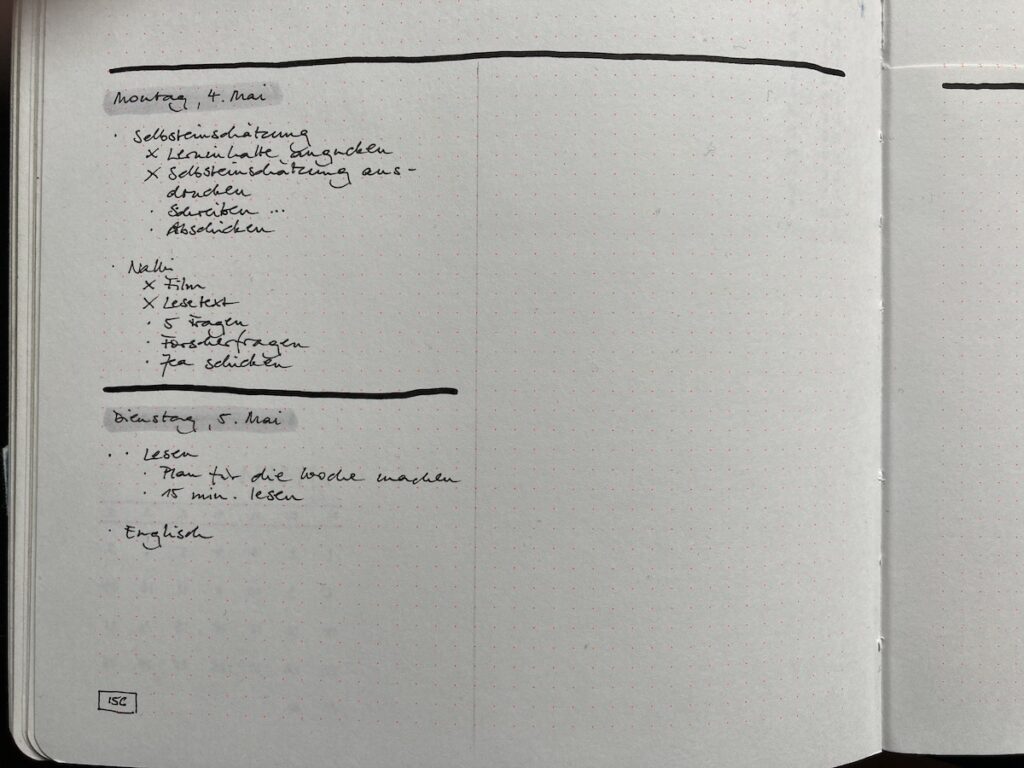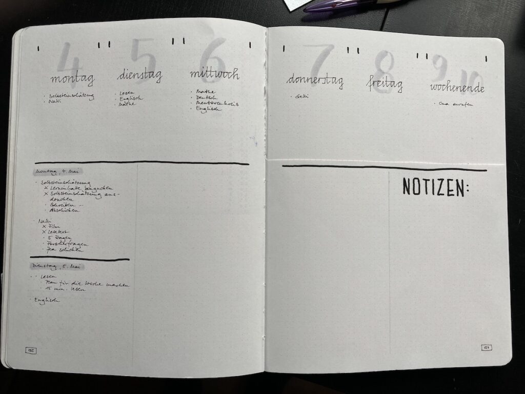 Dann schauen wir mal, wofür man das gebrauchen kann. Ich würde die erste Hälfte als Lernplaner nutzen. Habt ihr eigentlich meinen letzten Beitrag dazu gelesen? Wenn nicht: Macht das, Leute! Es kann euch im Moment euer Leben erleichtern! (Es reicht auch, die Bilder anzugucken, um zu verstehen, worum es geht.) Ob ihr das als Rapid Log macht oder auf die Wochentage verteilt, ist euch überlassen. Probiert mal aus, was besser zu euch passt.