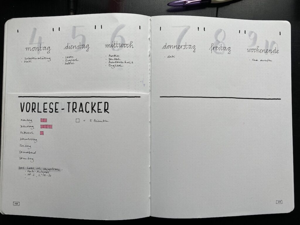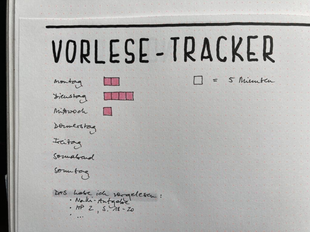 Und die Fünftklässler? Gibt es etwas, was ihr täglich tun sollt? Wie sieht’s mit Englisch-Vokabeln aus? Ansonsten passt dort natürlich auch jeder andere Tracker hin, den du in dieser Woche führen willst.