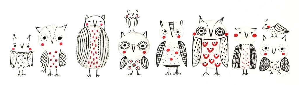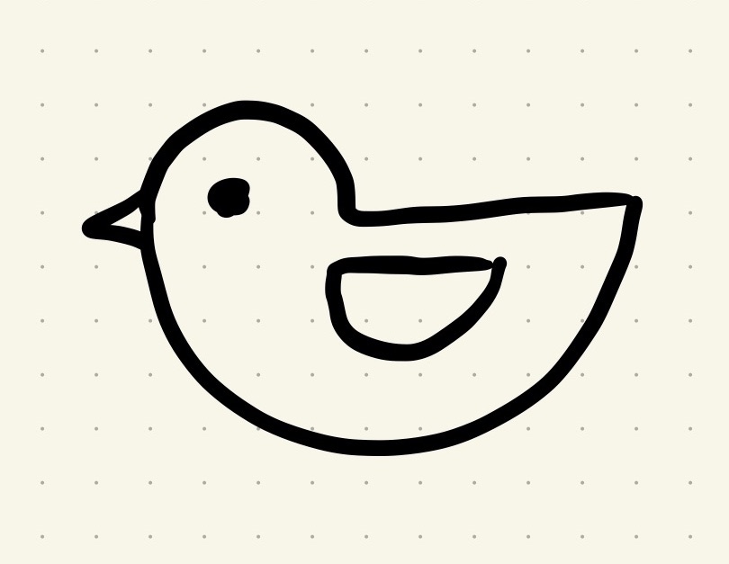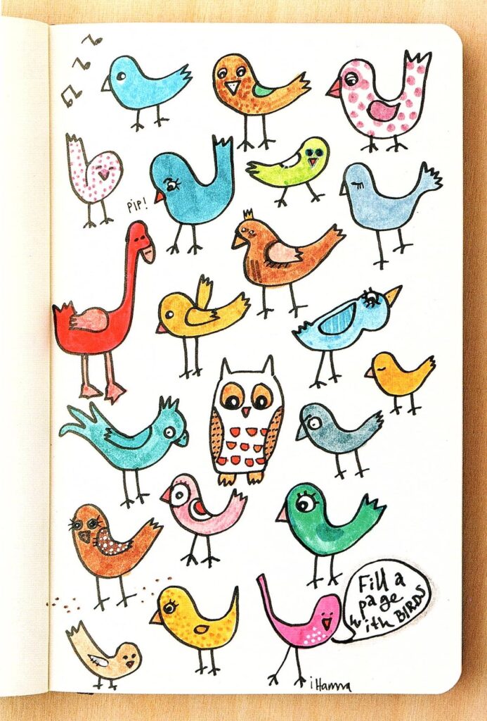 Eine schöne Übung, um sich ein bisschen zu lockern, ist diese: Nimm den Stift (irgendeinen) einfach mal in die andere Hand und zeichne „eine Million mal“ immer wieder das gleiche, mal groß, mal klein, mal nah beieinander, mal nicht. Zum Beispiel dieses Vögelchen – genau genommen besteht es nur aus drei Halbkreisen, einem Dreieck und einem Punkt):
