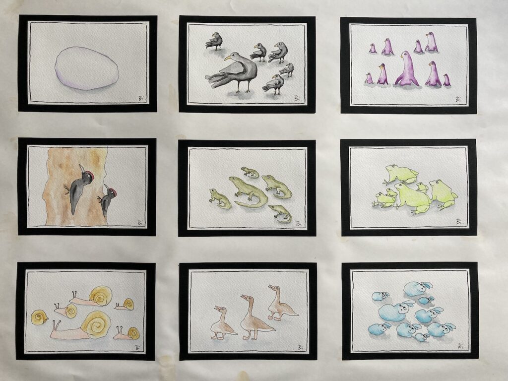 Und hier kommt ein absoluter Geheimtipp von mir (der in Wirklichkeit gar nicht geheim ist): Viele kleine Bildchen auf eine Seite zu bringen, verzeiht sofort kleine Fehler oder einzelne Zeichnungen, mit denen ihr vielleicht nicht ganz so zufrieden seid. In Gemeinschaft sieht so manches oft sofort schön aus, denn dann wird die Vielfalt sichtbar, die unser Leben und die ganze Welt auszeichnet. Oder?