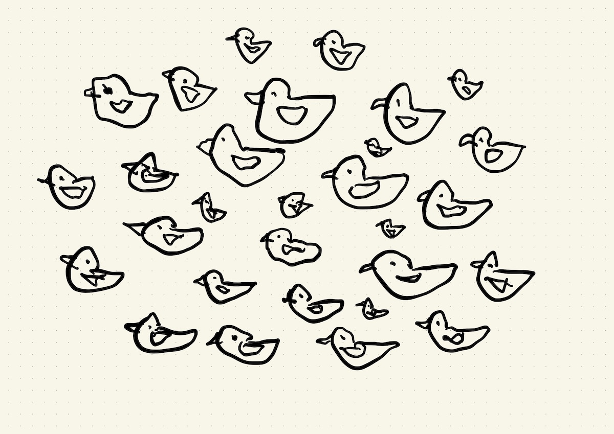 Eine schöne Übung, um sich ein bisschen zu lockern, ist diese: Nimm den Stift (irgendeinen) einfach mal in die andere Hand und zeichne „eine Million mal“ immer wieder das gleiche, mal groß, mal klein, mal nah beieinander, mal nicht. Zum Beispiel dieses Vögelchen – genau genommen besteht es nur aus drei Halbkreisen, einem Dreieck und einem Punkt):