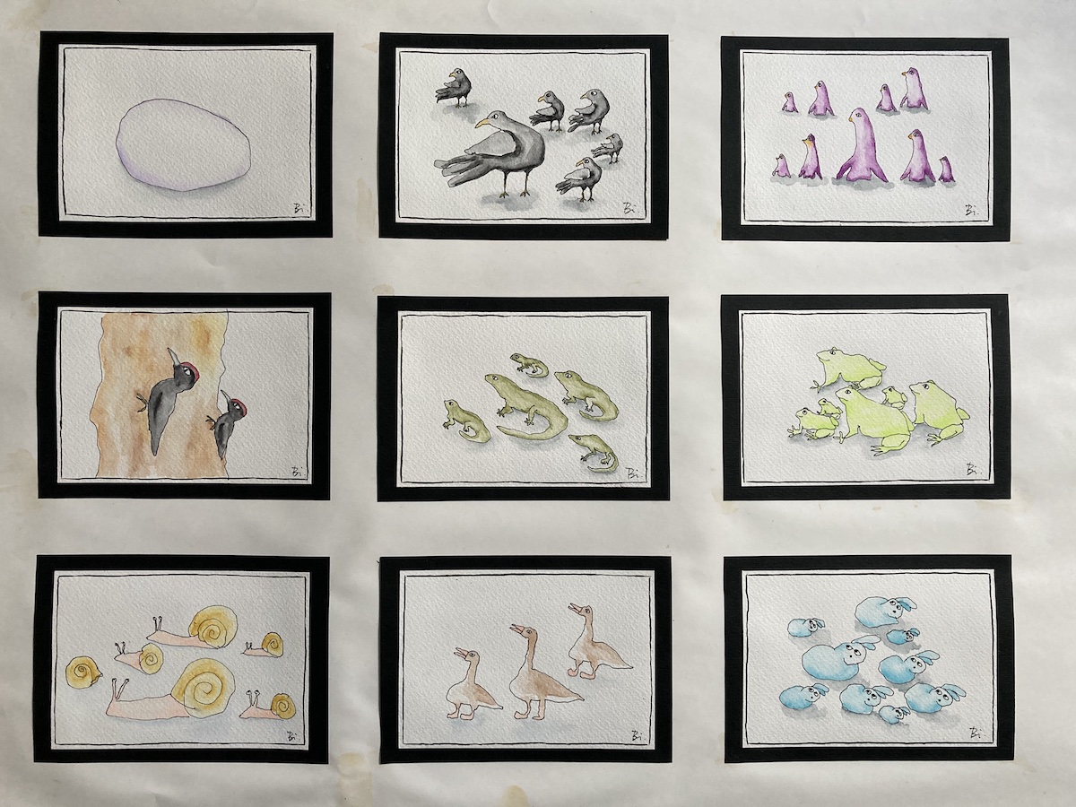 Und hier kommt ein absoluter Geheimtipp von mir (der in Wirklichkeit gar nicht geheim ist): Viele kleine Bildchen auf eine Seite zu bringen, verzeiht sofort kleine Fehler oder einzelne Zeichnungen, mit denen ihr vielleicht nicht ganz so zufrieden seid. In Gemeinschaft sieht so manches oft sofort schön aus, denn dann wird die Vielfalt sichtbar, die unser Leben und die ganze Welt auszeichnet. Oder?