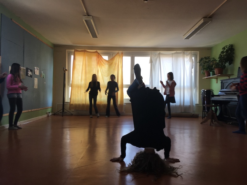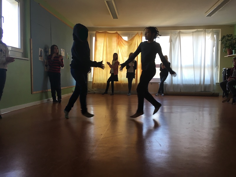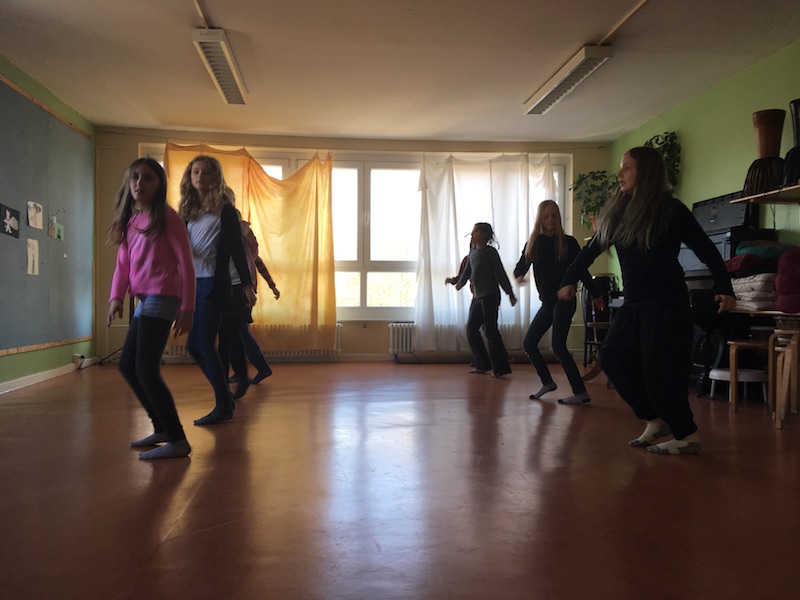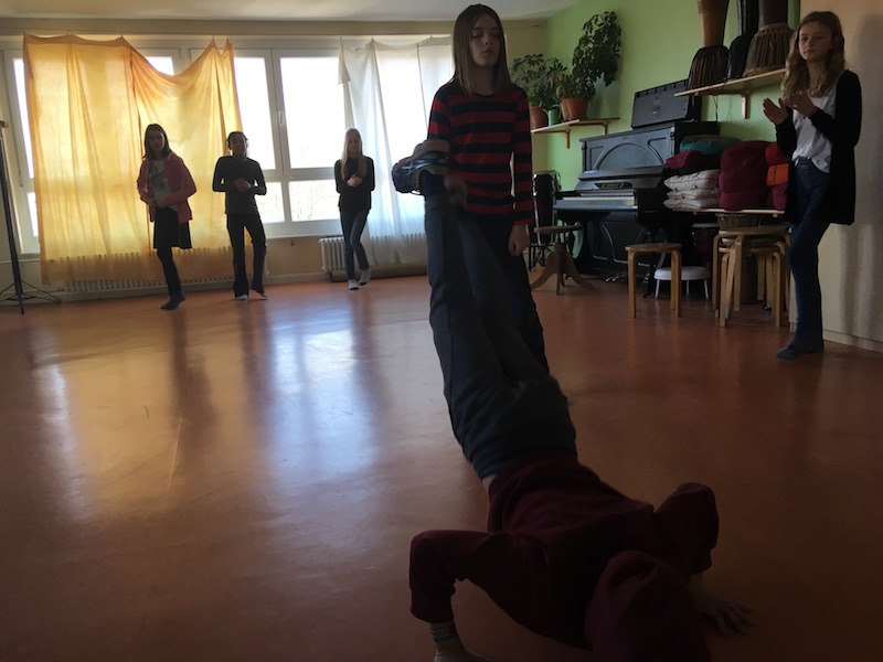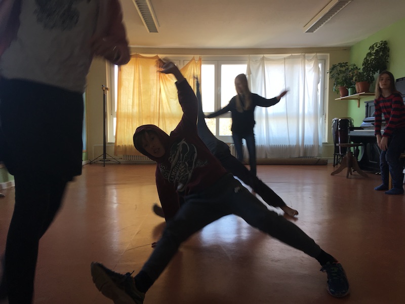 Am Mittwoch haben wir, glaub ich, als erstes noch mal die verkackten Stellen und noch die übrig gebliebenen Stellen eingesungen. In der 2. GZ haben wir das Musikvideo gedreht. Weil manche Kinder die Idee vom Tag davor nicht so toll fanden, hatte Nele sich eine neue Idee ausgedacht. Wir sind vom Bolzplatz über die Straße durch die Schule hoch in den Deutschraum getanzt. Nele hat uns gefilmt und ist die ganze Zeit hinter uns hergelaufen. Wir haben das Video mit einem One-Take gemacht und Birgit hat ganz am Ende dann unseren Gesang raufgelegt.