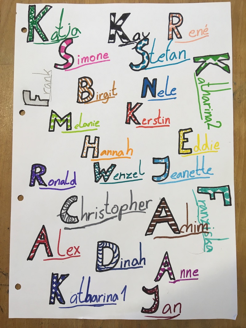 Im Foyer hängen ganz viele Jubileen-Plakate. Sechs Menschen feiern ihr Jubiläum, eine von ihnen ist Birgit. Birgit ist jetzt schon 15 Jahre auf der Freien Schule Potsdam. Sie ist die Deutschlehrerin der Oberen Etage und die Klassenlehrerin der Wilden 15.