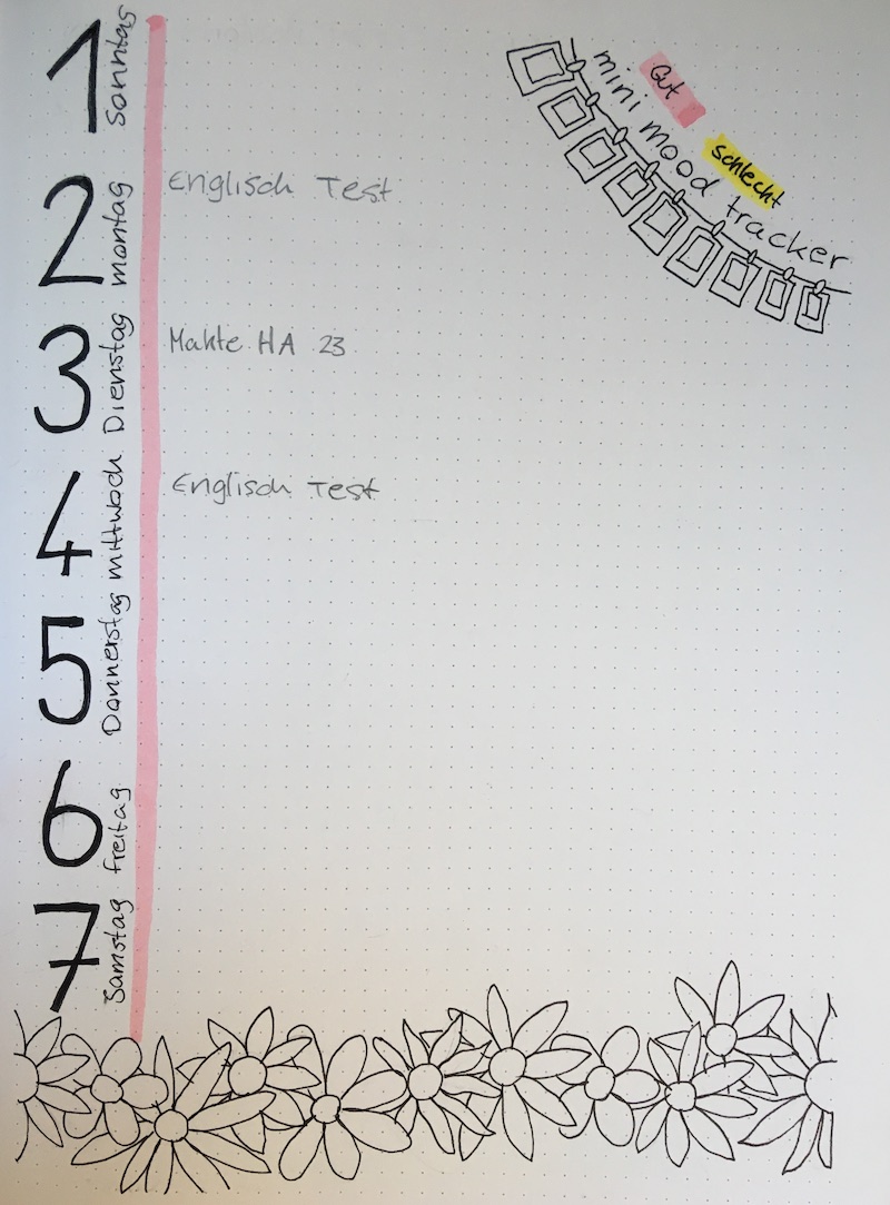 Bullet Journal ist ein selbstgestalteter Kalender. Das Bullet Journal ist ein sozusagenes Notizbuch, das meistens von innen gepunktet ist. Ein Bullet Journal besteht aus einem Index, einem Future Log (das ist eine Jahresübersicht), dann besteht es noch aus einer Monatsübersicht für jeden Monat und aus den verschiedenen Wochen. Das sind die Grundseiten. Dann kann man je nachdem auch noch einen Mood-Tracker machen, das ist ein Tracker, wo man sich jeden Abend einschätzt und in sein Bullet Journal schreibt. Man kann sich auch noch selber Seiten ausdenken.